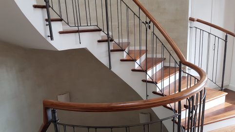 מדרגות מעץ אירוקו גושני אדריכל: מתי רוזנשיין אדריכלים מדרגות מעץ אירוקו אפריקאי גושני. חזית מעוגלת. כיסוי מלא – רום ושלח, היוצר מראה אירופאי קלאסי ויוקרתי המשתלב עם הפרקט בבית.