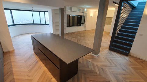 בית ברמת השרון אדריכלית: בת חן בוך פרקט אלון עתיק דיסטרס (פאזות שבורות) בגמר שמן מעושן ומדרגות. השמן יושם בבית הלקוח לאחר התקנת הפרקט בגוון לפי בחירת האדריכלית.