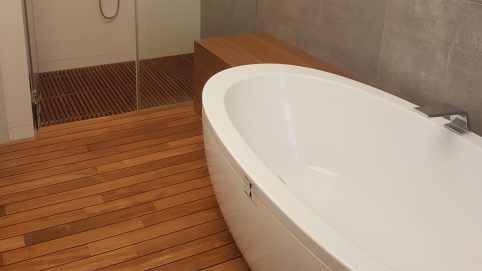 בית ברעננה דק פולימרי (סינטטי) בגוון אפור. האדריכל ביקש ליצור מראה קליל ועדכני שידגיש את הגינה הירוקה והמטופחת.